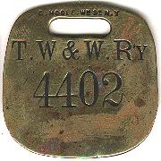An early Toledo Wabash & Western Railway check. The back has been incised (folk artitized) with the name F.J. SMITH. The stretch mark on this tag is because it was recycled after its original use into a device used by trappers to (1) hold the trap spring in place and (2) identify the owner of the trap. This has been verified by a collector who purchased a string of 5 traps, each of which had a baggage check attached to it. All of the checks that I have with names added to them have stretched out strap slots. |