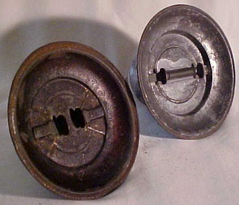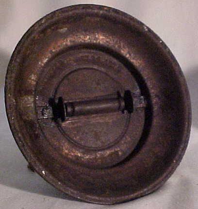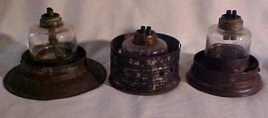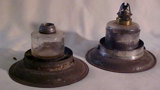 The American Glass (left) is very early (note the pewter collar). The 1868 base (note the tin fount retainer) has the spring extensions clearly visible. |