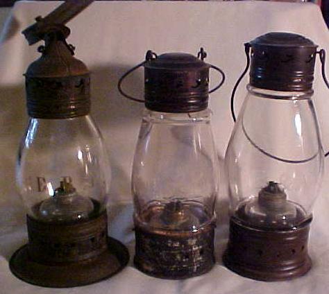 | Eastern Railroad with "nipple" top, triangular cut letters with no rings on the globe, standard "Brakeman" base and a pewter fount | Atlantic & Saint Lawrence Railroad "engine" style frame with a cast globe and pewter collar. Note the bail is through the top. | Boston & Albany cut globe with applied rings and a "hybrid" 1868 base. Note the bail is under the top. |