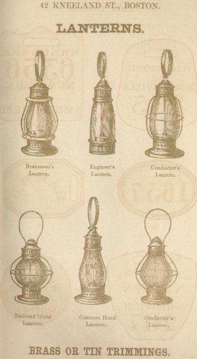 There are often errors made when attempting to date and identify manufacturers of these lanterns. It is very difficult to date some of these early pieces, so a good place to start is with some factual documentation on how early these lanterns really are. An 1859 John Robbins Catalog for Baggage Checks has a page of lanterns sold by Robbins to his customers. There is no implied original manufacturer of these lanterns. Robbins bought them wholesale and resold them. By the late 1860s Robbins didn't offer lanterns in his catalog. The image below states that any model can be made of brass or tin. It is generally assumed that brass models are typically "Conductor" models and that tin models are typically "Engine" or "Brakeman" models. The types of lanterns available: