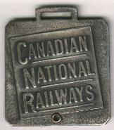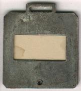 Used by an individual to identify themselves. This version has an advertisement for the Canadian National Railway on the front. The material is two pieces of soft white metal casting (in a sandwich) between a paper insert that is covered by a piece of plastic. The plastic provides the "window" that can be seen on the reverse side. Note the small strap opening size. The strap would also help to keep the brass pivoting mechanism from opening. |