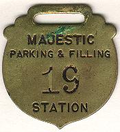 A nice fancy shape for a parking tag. This one came with a twin and their original leather strap. The green color is the effect that leather conditioner has over time on the brass. This is not terribly unusual to see. |