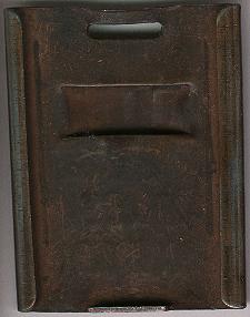 SachsLawlor is a fairly obscure maker. The hallmark clearly states that the patent is pending. There is a punched out "hump" protruding out of the top (face) which is large enough to get a leather strap through. There is only one slot, which is uncommon for "shell" style checks. The reverse side has parallel "bends" which accept a paper insert. The base of the reverse side has a "stopper" to help keep the insert from sticking out of the bottom. The bend for the stopper can be seen on the front view in the center where there is discoloration in the center at the bottom of the hallmark.