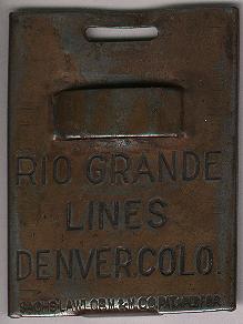 | Rio Grande Lines Denver Colorado - Very large lettering with no number. The patina is a copperish brown and worn through in several places. The "hump" seems a little beaten up, but it is intact. With the scarcity of Colorado material in general, this is nice check to pick up when available. Note that the images have been enlarged for clarity. | |