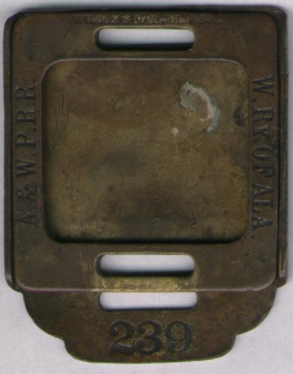 (1) this is an interline tag A&WP and W of A (2) Only A&WP (and tag home base of Montgomery) is on the "main" tag (3) there is a number on the back of the main tag (4) the main tag has a double slot at the bottom (5) the window on the insert is large and might have accepted a cardstock destination (6) the main tag has curved sides that "fit" with the insert perfectly (see bottom image above) |