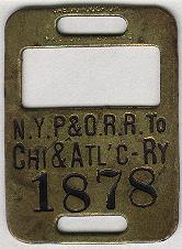 | New York, Pennsylvania & Ohio to Chicago & Atlantic Railway. This check was made by Murdock and not Wilcox. The maker's hallmark is over the slot and the patent date is just below the slot. | Gulf Coast & Santa Fe, St. Louis, Iron Mountain & Southern via Texas & Pacific Railway. No maker hallmark, just the patent date. Yes, it's cracked but I could care less! | |