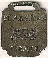 St. Mary and Southwestern RR Through example The St M. & SW RR was existed between 1893 and 1897. This helps to determine which of the two makers hallmarks is earlier. Note the italicized numerals. The hallmark area above the slot is bent, but legible. |